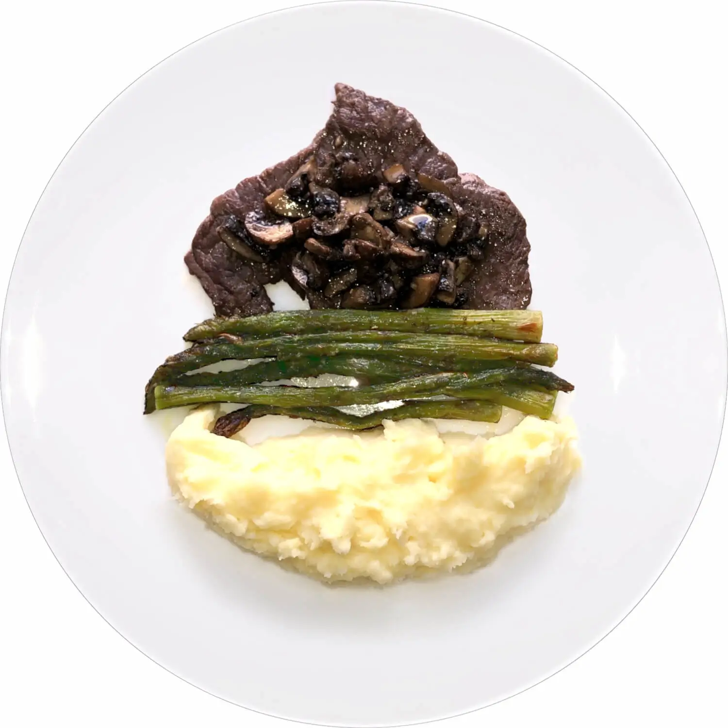 Телетина са пире кромпиром, печуркама у вину и шпарогама.